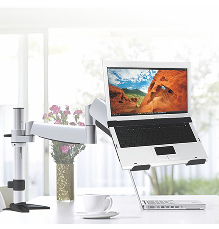 Подставка для ноутбука в комплекте с кронштейном позволяет закрепить ноутбук на уровне глаз и свободно перемещать его в пространстве легким движением руки.