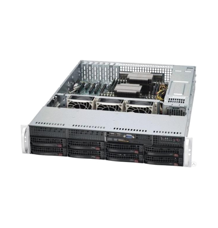 Шасси 2U, низкопрофильный брекет, 8-ми портовый бекплейн, 8 дисковых отсеков, поддержка всех итераций ATX материнских плат, избыточные блоки питания 800W.