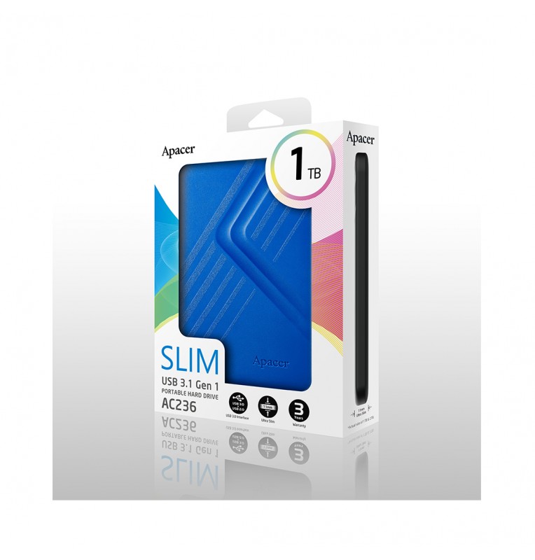 Apacer AC236 это экстремально лёгкий и ультра-тонкий внешний диск. С толщиной всего 11 мм, он легко помещается в кармане и становится легким портативным помощником хранения. Строгое тестирование на 10 000 подключений/отключений, позволяет обеспечить премиальное качество USB разъёма даже при длительном использовании, обеспечивая стабильное чтение и передачу данных. AC236 имеет встроенную функцию смарт-управления питанием, которая автоматически переключается на режим энергосбережения, если передача данных прекращается в течение 10 минут или более, эффективно продлевая срок службы диска. Портативный жесткий диск Apacer вместе с программой Apacer Data Manager предоставляют безопасную и удобную платформу для хранения данных, которая поддерживает однонаправленную и двунаправленную синхронизацию, дает возможность резервного копирования важных личных файлов и эффективно повышает производительность работы, что делает Вашу жизнь еще более комфортной благодаря удобной системе цифрового хранения данных!