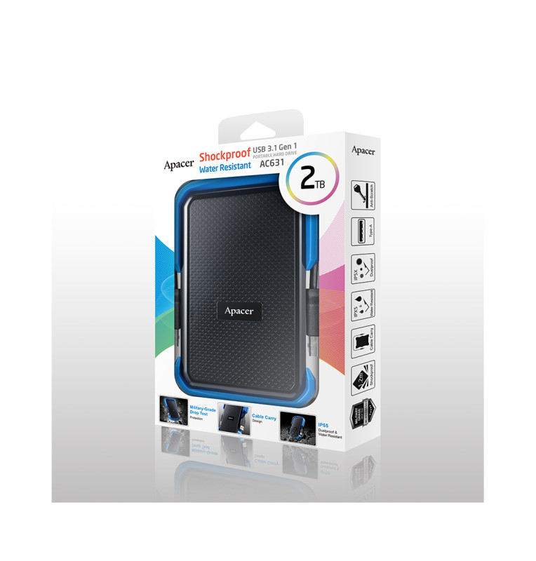 Класс защиты - "милитари" AC631 протестирован по стандарту процедуры IV MIL-STD-810G 516.6 (тест на случайное падение), что означает защиту при случайном падении с высоты до 1,22 метра. Водонепроницаемость и пылезащиту по сертификату IP55. Благодаря полностью герметичной конструкции, AC631 сертифицирован по классу IP55 и может защитить данные в проливной дождь или в пыльной окружающей среде. Защита от царапин. Объёмные текстуры на корпусе не только подчёркивают спортивный дух AC631, но и препятствуют появлению царапин и отпечатков пальцев. Удобная конструкция крепления для кабеля USB. Продуманная конструкция кожуха оборудована слотом для хранения кабеля USB. Прочный разъём USB Type-A. AC631 использует разъём USB Type-A, который прошёл испытания на 10000-кратное подключение/извлечение штекера, обеспечивая гарантированную безопасность для пользователей. Быстрое создание резервной копии / Легкая синхронизация. Портативный жесткий диск Apacer вместе с программой Apacer Data Manager предоставляют безопасную и удобную платформу для хранения данных, которая поддерживает однонаправленную и двунаправленную синхронизацию, дает возможность резервного копирования важных личных файлов и эффективно повышает производительность работы, что делает Вашу жизнь еще более комфортной благодаря удобной системе цифрового хранения данных!
