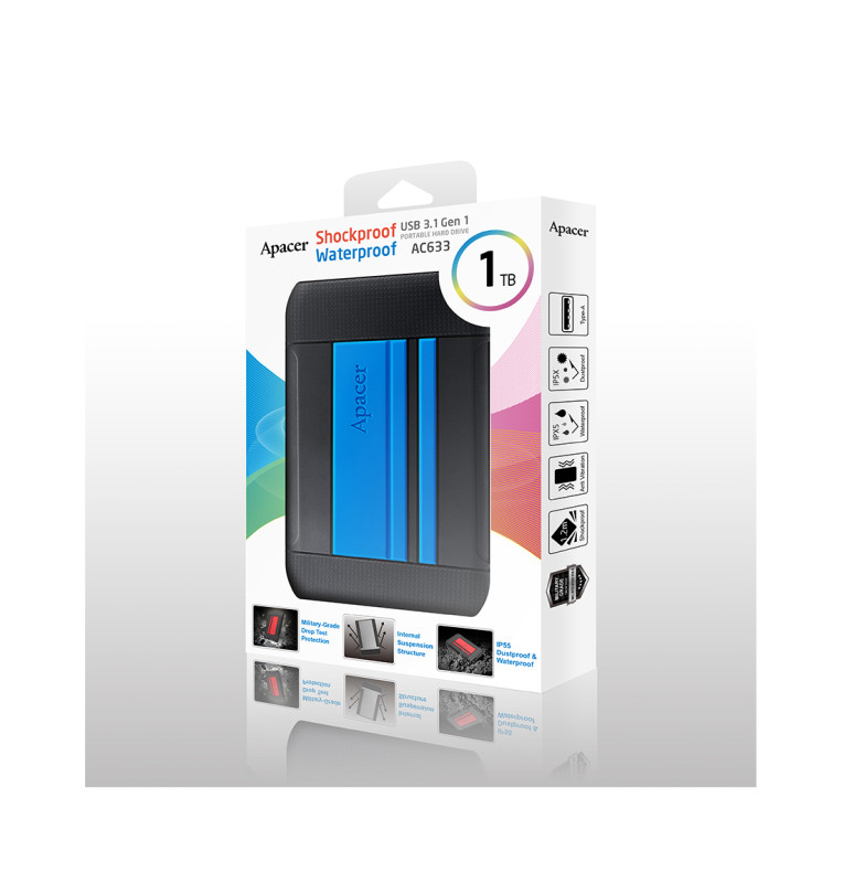 Независимая внутренняя подвеска снижает вибрации и минимизирует удары, вызванные случайными падениями. Противоударная защита военного класса, AC633 прошел тест MIL-STD-810G 516.6. Процедура IV (испытание на падение). Это означает, что хранящиеся данные не повреждаются при случайном падении с высоты 1,22 метра. Превосходное резиновое покрытие AC633 может противостоять попаданию воды и пыли. В пыли или дожде, он может легко справиться со своими задачами. AC633 использует прочный разъём USB Type-A, который прошёл проверку на 10 000 включений/отключений, тем самым обеспечивая гарантию безопасности для пользователей. Скорость передачи данных AC633 достигает 5 Гбит/с. Преимущество во времени резервного копирования и передачи большого количества аудио- и видеофайлов.