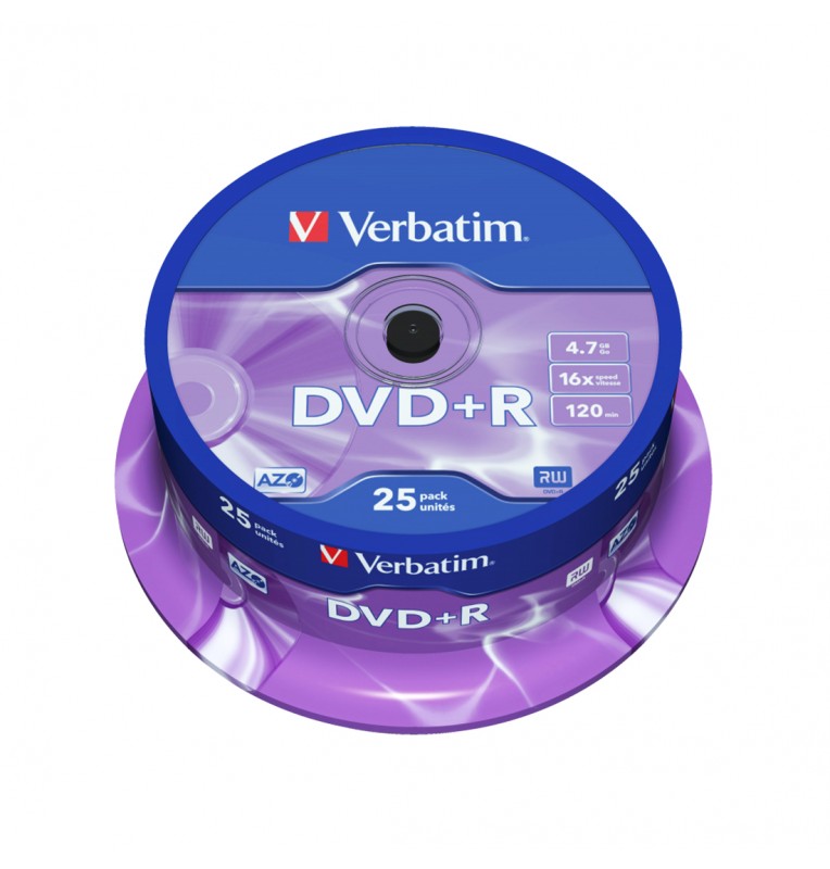 Диск DVD+R, Verbatim, (43500) 4.7GB, 16х, 25шт в упаковке, Незаписанный