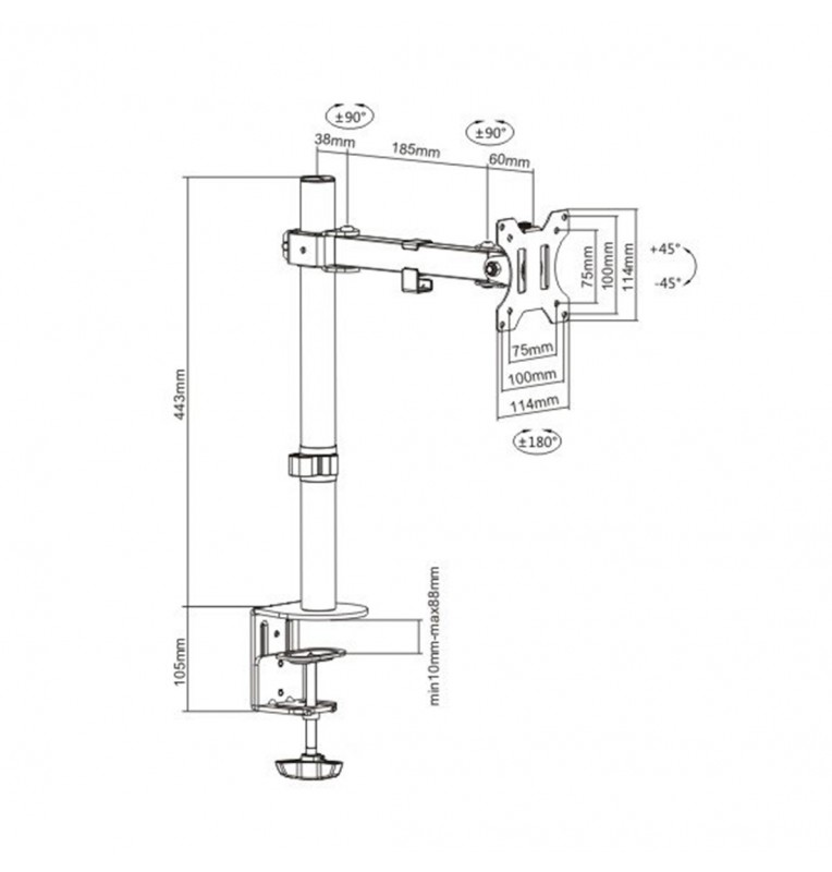 Настольный кронштейн для мониторов, Brateck, LDT12-C011, 13"-32", Нагрузка 8 кг., Наклон +/- 45°, Поворот +/- 90°, Вращение монитора +/- 180°, VESA 75x75,100x100.